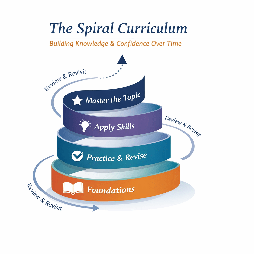 Rather than teaching a topic once and moving on, I use a spiral approach.
